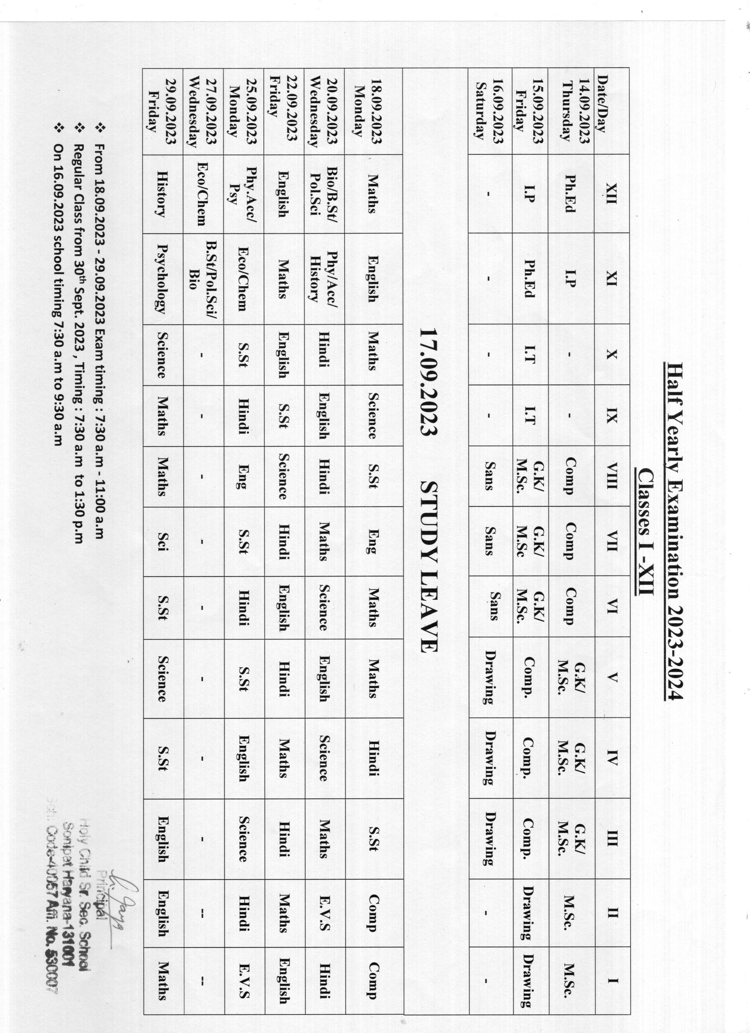 HALF YEARLY EXAM DATE SHEET 2023-24